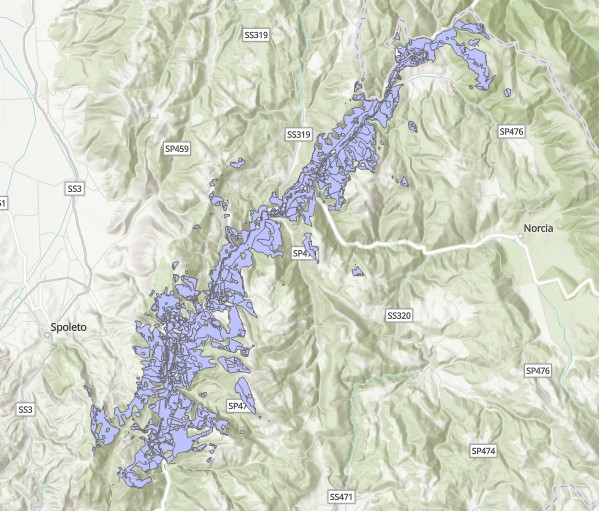 Description: Poligoni di visibilità dalle strade SS209 e SR209 nella Provincia di Perugia