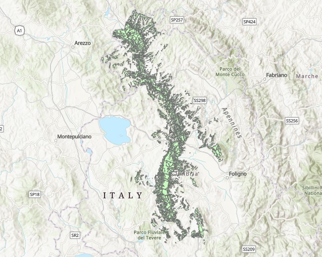 Description: Poligoni di visibilità dalla strada SGC E45 nella Provincia di Perugia