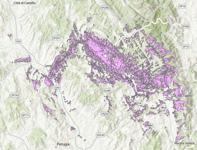 Description: Poligoni di visibilità dalle strade SS76 e SS SR219 nella Provincia di Perugia